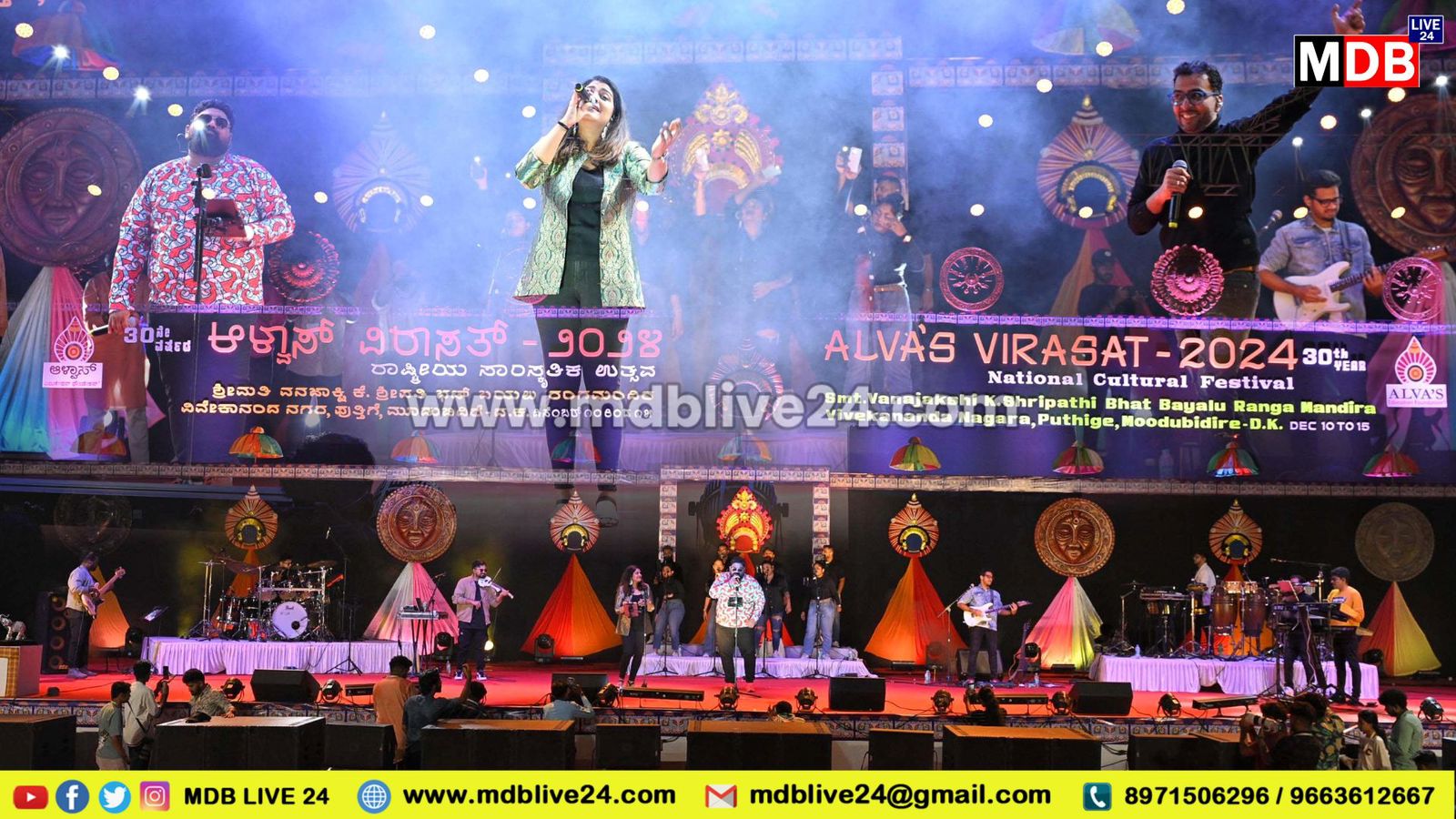 ಮೂಡುಬಿದಿರೆ: ‘೩೦ ನೇ ಆಳ್ವಾಸ್ ವಿರಾಸತ್’ನಲ್ಲಿ ಉತ್ತರದ ಹಿಂದೂಸ್ತಾನಿ, ಪಶ್ಚಿಮದ ಗುಜರಾತಿ, ಪೂರ್ವದ ಕೋಲ್ಕತ್ತಾ ಸಂಗೀತದ ನಿನಾದ ಸವಿದ ಪ್ರೇಕ್ಷಕರಿಗೆ ಶನಿವಾರ ದಕ್ಷಿಣ ದ್ರಾವಿಡ ಸಾಹಿತ್ಯ-ಸಂಗೀತ ಲೋಕದ ಸಂಭ್ರಮ. ಕನ್ನಡ, ತಮಿಳು, ತೆಲುಗು, ಮಲೆಯಾಳ, ಸ್ವಲ್ಪ ಹಿಂದಿ ಮಿಶ್ರಣ ‘ವುಡ್’ಗಳ ಸಿನಿಮಾ ಹಾಡುಗಳ ಸಿಂಚನವು ಆಳ್ವಾಸ್ ವಿರಾಸತ್ನ ಶ್ರೀಮತಿ ವನಜಾಕ್ಷಿ ಕೆ. ಶ್ರೀಪತಿ ಭಟ್ ವೇದಿಕೆಯಲ್ಲಿ ಚೆನ್ನೈಯ ಸ್ಟೆಕೇಟೋ ಬ್ಯಾಂಡ್ ತಂಡವು ನಿರಂತರ ಅಬ್ಬರದಲ್ಲಿ ನಡೆಸಿಕೊಟ್ಟ ಸಂಗೀತ ರಸಸಂಜೆಯ ಆರಂಭದಲ್ಲಿ ವಯೋಲಿನ್ ನಲ್ಲಿ ಸಾಯಿ ರಕ್ಷಿತ್ ಅವರು ಮಣಿರತ್ನಂ ನಿರ್ದೇಶನದ ‘ರೋಜಾ’ ಸಿನಿಮಾದ ‘ರೋಜಾ ಜಾನೇ ಮನ್’ ನುಡಿಸುವ ಮೂಲಕ ಸಂಗೀತ ರಸ ಸಂಜೆಗೆ ನಾಂದಿ ಹಾಡಿದರು.