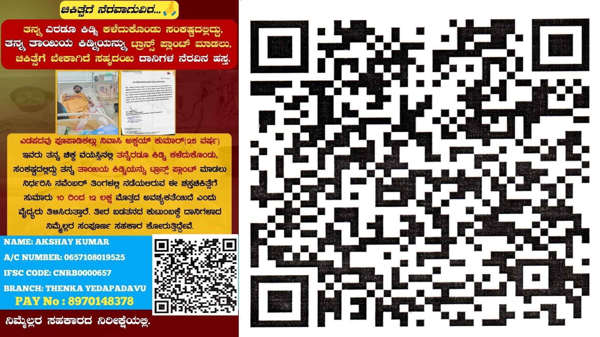 ಎಡಪದವು ಪೂಪಾಡಿಕಲ್ಲು ನಿವಾಸಿ ಅಕ್ಷಯ್ ಕುಮಾರ್(25 ವರ್ಷ) ಇವರು ತನ್ನ ಚಿಕ್ಕ ವಯಸ್ಸಿನಲ್ಲಿ ತನ್ನೆರಡೂ ಕಿಡ್ನಿ ಕಳೆದುಕೊಂಡು, ಸಂಕಷ್ಟದಲ್ಲಿದ್ದು ತನ್ನ ತಾಯಿಯ ಕಿಡ್ನಿಯನ್ನು ಟ್ರಾನ್ಸ್ ಪ್ಲಾಂಟ್ ಮಾಡಲು ನಿರ್ಧರಿಸಿ ನವೆಂಬರ್ ತಿಂಗಳಲ್ಲಿ ನಡೆಯಲಿರುವ ಈ ಶಸ್ತ್ರಚಿಕಿತ್ಸೆಗೆ ಸುಮಾರು 10 ರಿಂದ 12 ಲಕ್ಷ ಮೊತ್ತದ ಅವಶ್ಯಕತೆಯಿದೆ ಎಂದು ವೈದ್ಯರು ತಿಳಿಸಿರುತ್ತಾರೆ. ತೀರ ಬಡತನದ ಕುಟುಂಬಕ್ಕೆ ದಾನಿಗಳಾದ ನಿಮ್ಮೆಲ್ಲರ ಸಂಪೂರ್ಣ ಸಹಕಾರ ಕೋರುತ್ತಿದ್ದೇವೆ.