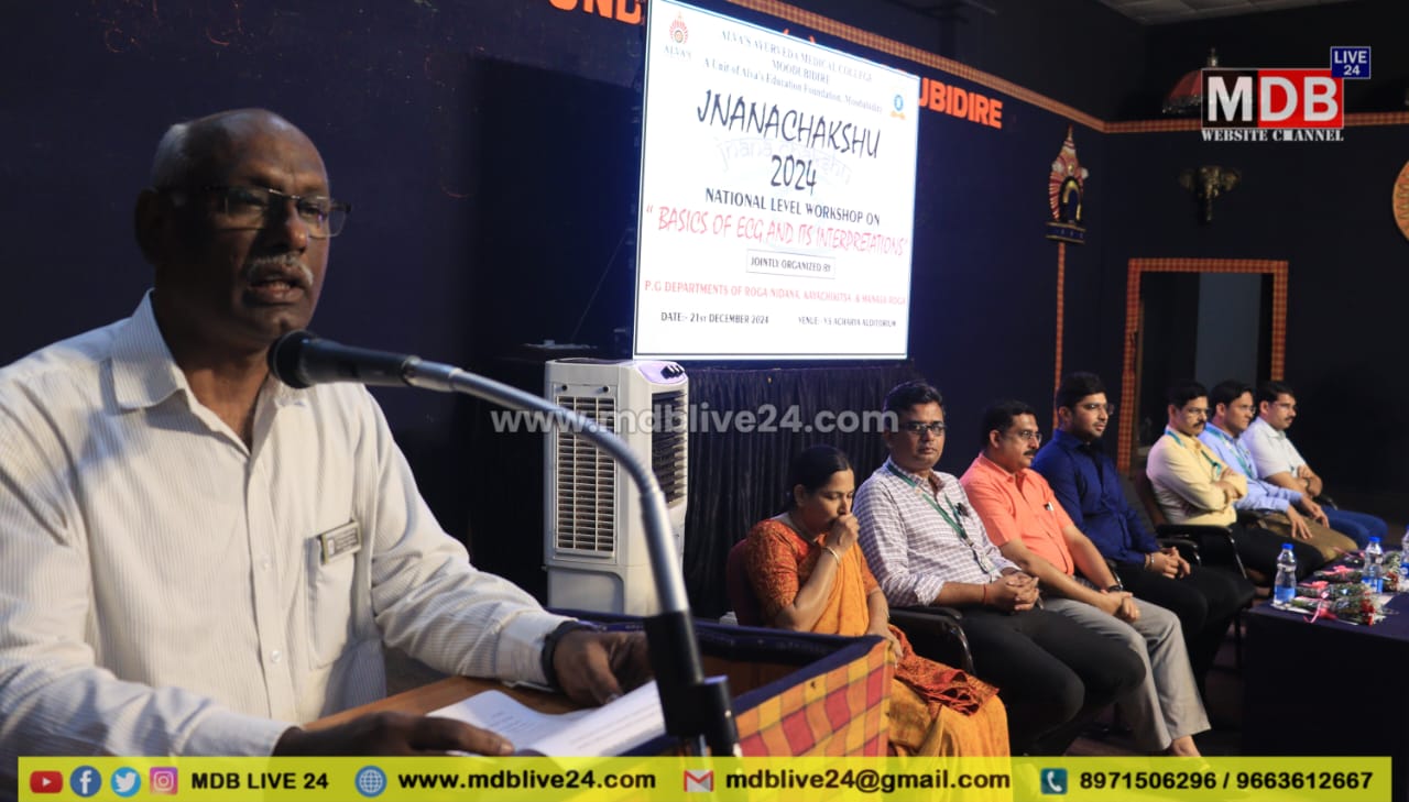 ಆಳ್ವಾಸ್ ಆಯುರ್ವೇದ ಮೆಡಿಕಲ್ ಕಾಲೇಜುವತಿಯಿಂದ ಶನಿವಾರ ನಡೆದ ‘ಜ್ಞಾನಚಕ್ಷು-2024′- ‘ಈಸಿಜಿಯ ಮೂಲಭೂತ ಅಂಶಗಳು ಹಾಗೂ ಅದರ ವ್ಯಾಖ್ಯಾನಗಳು’ ವಿಷಯದ ರಾಷ್ಟ್ರ ಮಟ್ಟದ ಕಾರ‍್ಯಗಾರದಲ್ಲಿ ಮಾತನಾಡಿದರು.